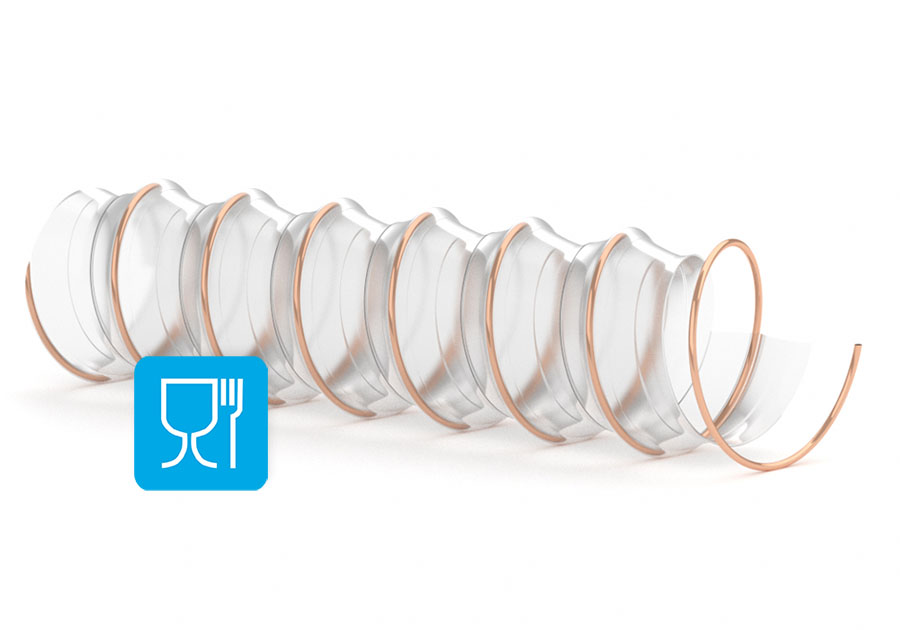 Livsmedelsgodkänd polyuretanslang för utsugning av lättare spån, gaser, ångor och lösningsmedel. Även lämplig för transport av torra livsmedel.